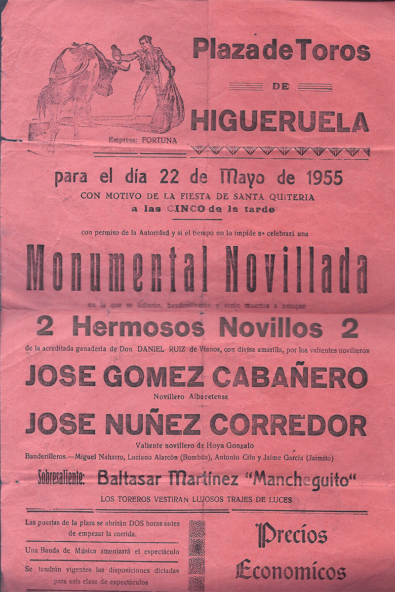 En principio, pensábamos que la corrida se celebró el año 1956, pero al encontrar el cartel donde se anunciaba el festejo, se disiparon todas las dudas, Se celebró en las fiestas del pueblo el año 1955
