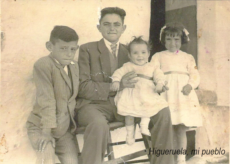 El domicilio familiar lo teníamos en Higueruela, en la calle Santa Lucia, esta casa era de mi abuelo Maximino. en su patio es donde se hizo esta fotografía de los cuatro hermanos. Nos sigue comentando Juan: En esta etapa de su vida es cuando Juan, con 8 a 12 años, zagal emprendedor e inquieto, conoció a José el de la Fiela, y le ayudó en la construcíón de alguno de los cucos de la zona. Mi hermano Maximino, mayor que yo, trabajaba para la casa con el ganado y labrando con la mula, Yo desde muy pequeño comencé a trabajar primero cuidando los cerdos y con el ganado. 'No fui nunca a la escuela, Un año, me apuntó mi padre a la academia con don Juan Manuel el maestro, pero comenzaron a parir las ovejas y lo tuve que dejar, estuve quince días. Como por aquí se dice 'cambiamos de amo' y hasta mi marcha a Valencia mi padre estuvo pastoreando y encerraba el ganado en la Hoya Hermosa en el corral de los Dionisios. Con 17 años me marché a Valencia, abriendo un camino que poco después siguió el resto de la familia, Con residencia todos en Valencia, donde marcharon entre los años 1959 y 1962.